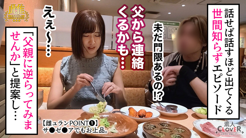 厳選した三ツ星のグラン美女を味わい尽くす【雌(メシ)ュランガイド2022】回のグラン美女は、夜の西麻布で出会った世間知らずのおっとりお嬢様【りなさん(28)/社長令嬢】。過保護で厳格な父親が選んだ相手と逆玉政略結婚。「愛とかはないんで」「お互い仮面夫婦です」と言い切るりなさん。経験人数も夫ただ一人。そんな青春を知らずに育った箱入り娘の初めての反抗期!「お父さんに怒られちゃう…」と後ろめたい気持ちもすぐに忘れる快楽漬け!「こんなにドキドキしたことない」「これが普通なんですか?」「もっとしたい、もっとして」夫以外のチンポに味を占めたお嬢様は「中出ししてください」と精子を懇願!お父さん、お嬢さんの成長した姿を見てください!#Dキス#胸揉み#手マンで潮吹き#オナニー#乳首舐め#フェラ#背面騎乗位#対面座位#正常位で中出し#2回戦#立ちバック#側位#バック#正常位で中出し。